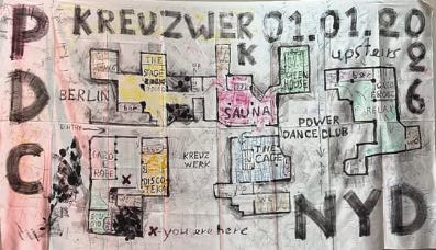 The lineup featured resident DJs not only from PDC but from other notable parties like Cocktail d’Amore, Lecken, Herrensauna, Mala Junta and PDA. As a result, apparently Berghain was largely bereft of queers for its New Year’s Party, and this not long after Ben Klock drew some ire around town for posing in front of the building with celebrity friends Harry Styles and Zoe Kravitz, as if club culture’s ultimate aim should be to make the pages of Hello! magazine. (Hey, a reminder to go buy my book, the last chapter of which dwells on Berghain’s celebrity-embracing-conspicuous-consumption era.) Kreuzwerk struck me as exactly what you hear about when misty-eyed people reminisce about the old Ostgut (unpretentious gay male-dominated down-at-heel party with quality music). A changing of the guard? Only if PDC leans more into techno bookings.