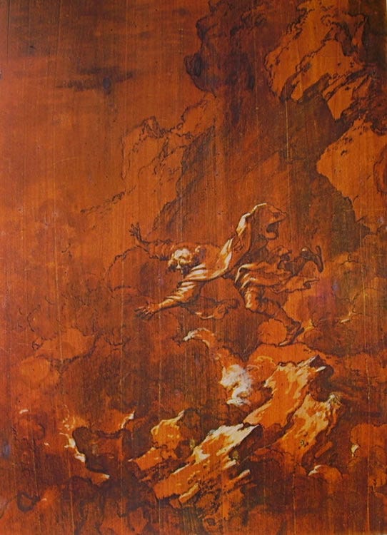 My spot was attained by ascending a rickety scaffolding staircase to an upper balcony going around the dancefloor like a proscenium, a decking path with wooden-bench seating at back and a railing in front, where I got the bright idea, given the heaving mass below, of dancing up on top of the bench, head not far from the ceiling, so that in this debauch of very high people I became the highest person, dancing on a summit with a view below of the dancefloor thick with smiling bodies, molten with sweat and sexiness, now and again imagining myself plummeting dizzily down into the fiery abyss like the ancient philosopher Empedocles who threw himself into Mount Etna.
