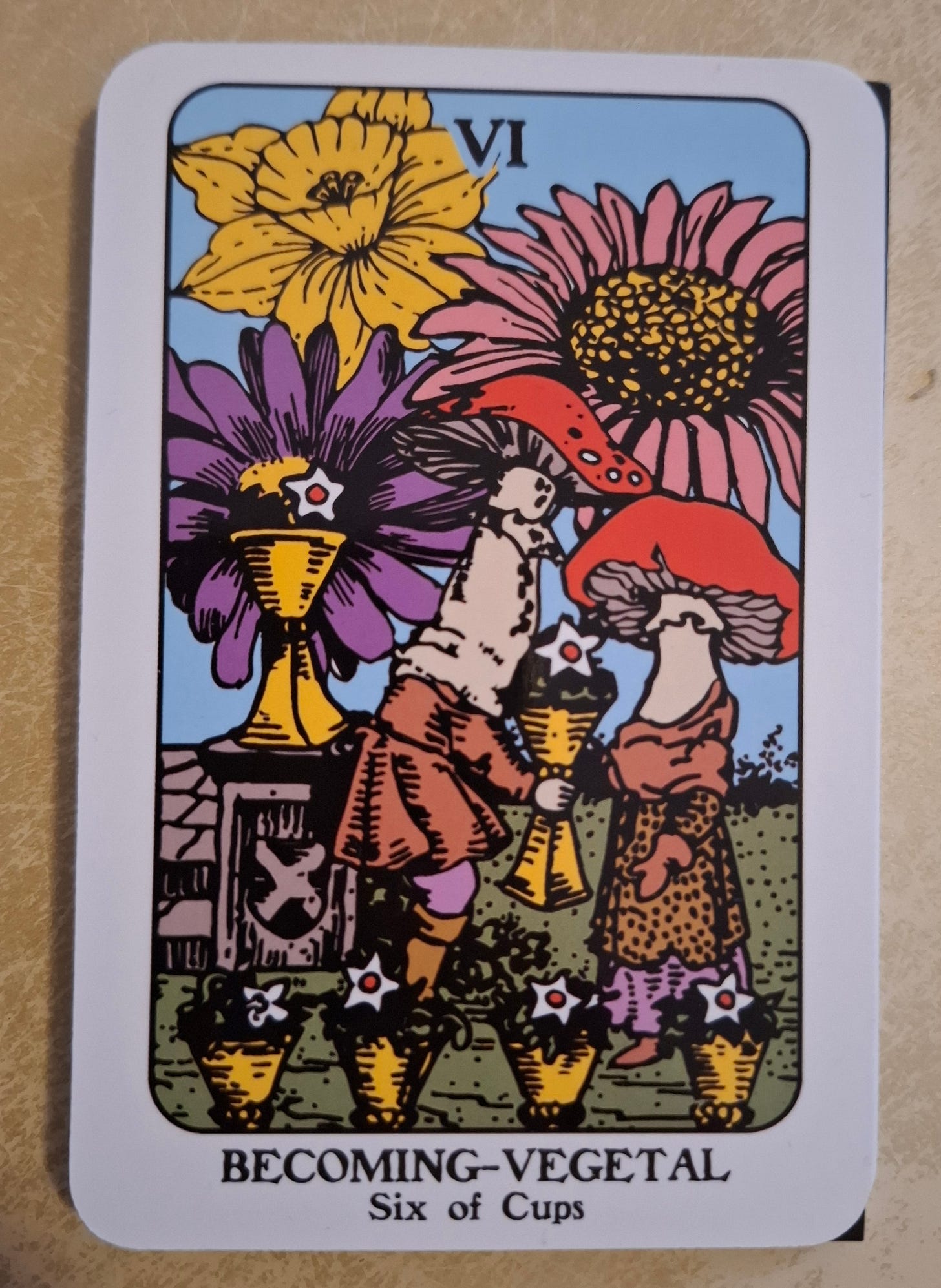 In the deck I have, gifted by a now ex-friend, the Six of Cups is re-fashioned as Becoming-Vegetal: the submission to Nature’s voracious becoming, which, through time passing, both creates and destroys us. In Western philosophy, being and becoming are defined in contradistinction: being is the steady state; becoming is the underlying, open-ended process of change.