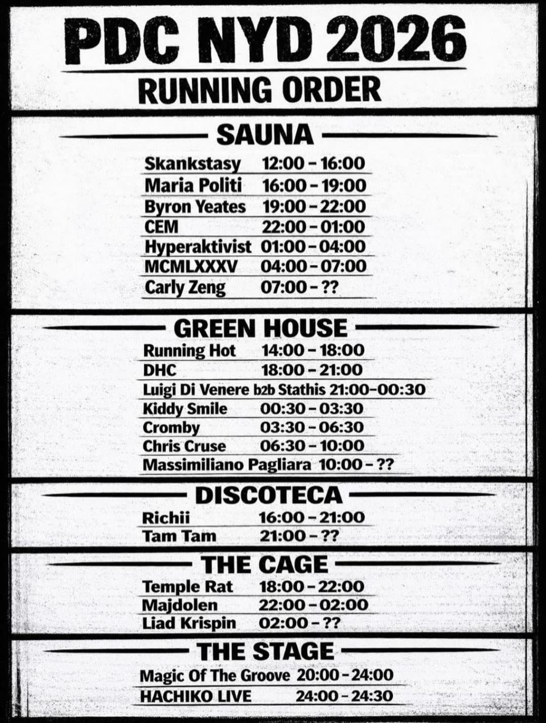 You might know that Power Dance Club (PDC) started in Greece before kicking off as well in Berlin. And you might know that over the past year or so, it’s grown to become one of the main queer parties in Berlin. This Silvester edition, though, really flexed its testo biceps. It wasn’t just the party’s scale, a scale on a par with (inevitable reference) Berghain, twenty DJs scattered across four spaces in a labyrinthine venue. Nor was it the hopeful/lamenting hours-long queue of hundreds of bodies willing to freeze their asses off to get inside. More, I was struck by how this edition of PDC represented a kind of grassroots queer collectives strike back! setup, a cute conglomerate of sorts.
